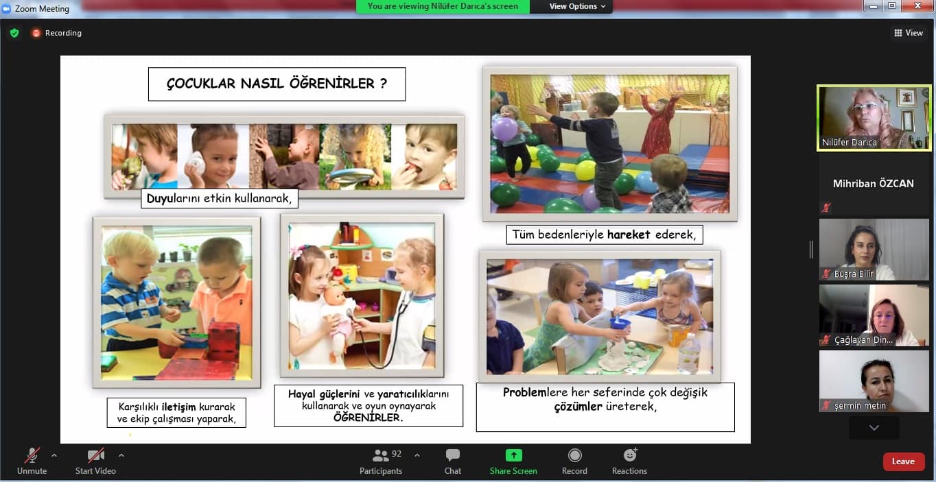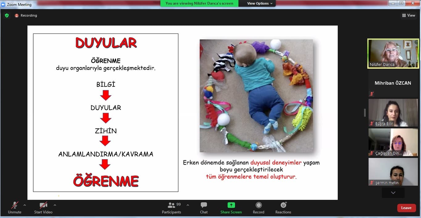 Darıca, şu sözlerle sunumunu devam ettirdi: “Çocukların 0-3 yaş arası; duyu eğitimi, görsel algı estetik, temel beceriler, materyal araç-gereç tanıma, 4-6 yaş arası; öyküler, resimli kitaplar, oyunlar, yaratıcı drama, müzik ve dans, sosyal çevre gezileri ile öğrenme yöntemleri yapılmaktadır. Burada genel olarak duyular ön plandadır. Duyular, öğrenmeyle, öğrenme ise duyu organları ile mümkündür. Bu süreçte bilgi, duyular, zihin, anlamlandırma/kavrama, ve sonuç olarak öğrenme ile tamamlanır. Problem çözme problemin tanımlanması, probleme ve çözümüne ilişkin bilgilerin toplanması, en uygun çözüm yolunun uygulamaya konulması ve sonucunun değerlendirilmesidir. Problem çözmede; öyküler, tekerlemeler, şiirler, günlük yaşantılar ve şarkılar çözümde etkilidir” dedi.