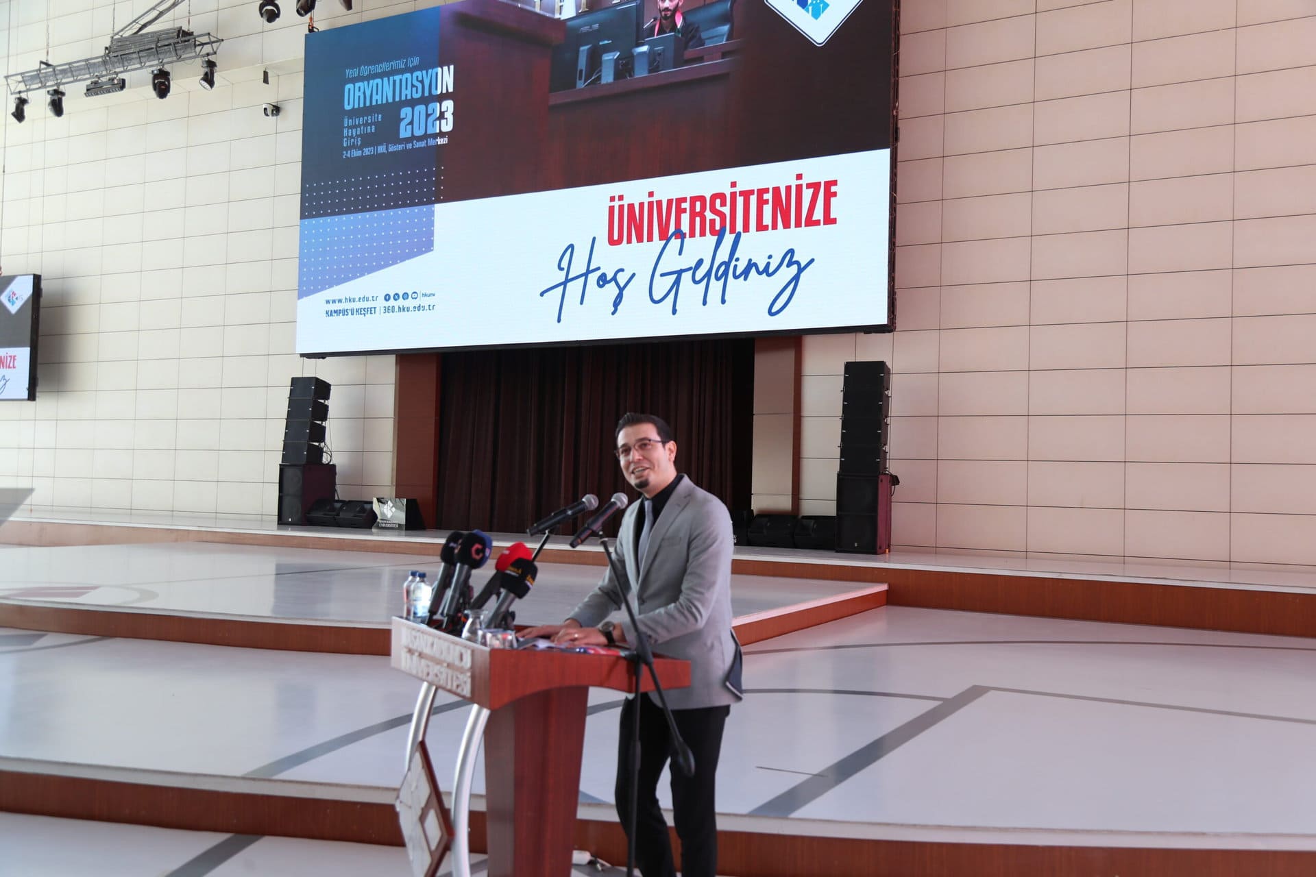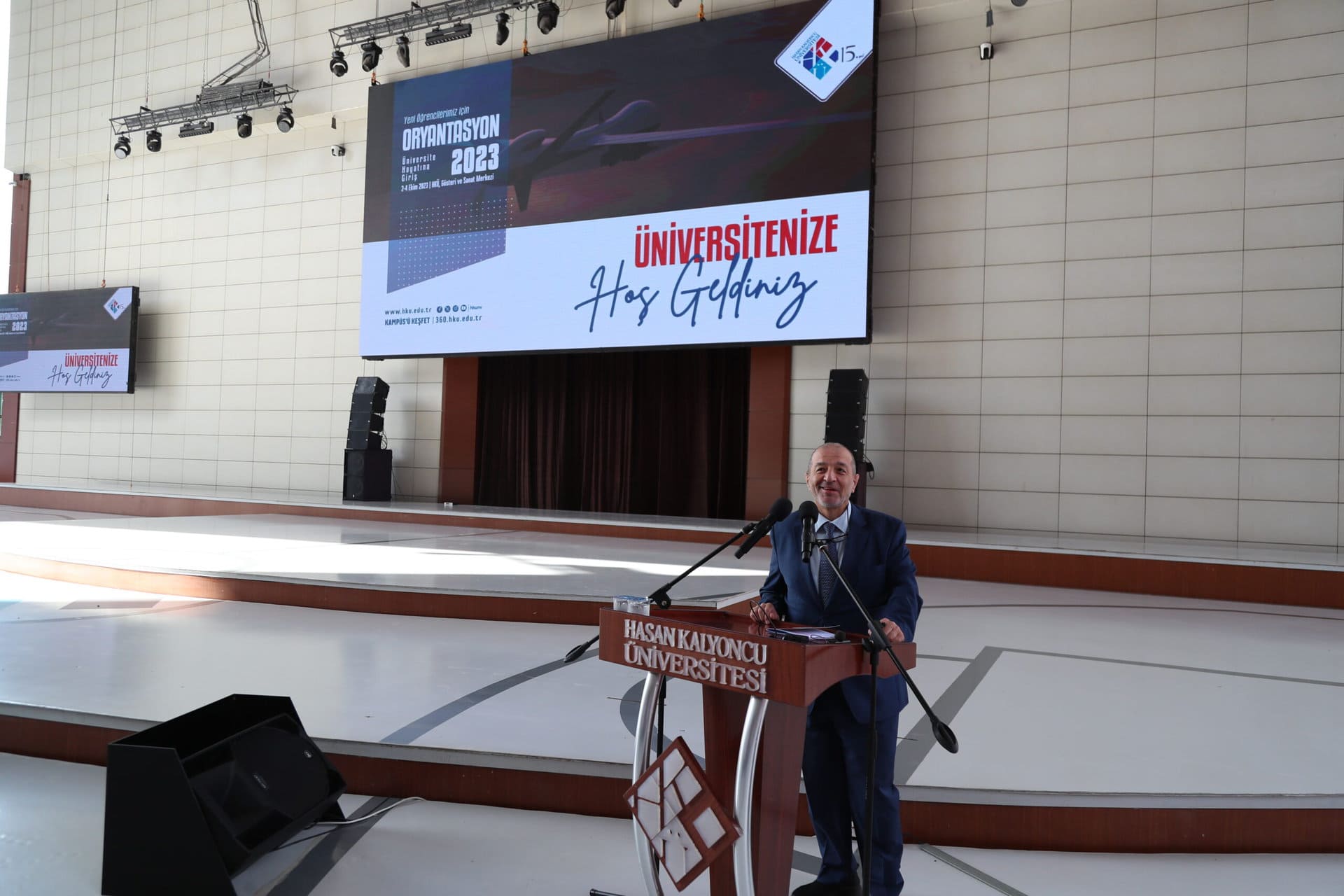 “Sizlerin, 2 veya 4 yıllık, önlisans veya lisans öğrencisi olarak, eğitim hayatınızı, akademik başarının yanında, beşeri ilimlere önem veren, sosyal ve kültürel kazanımların da bulunduğu sanatsal ve spor faaliyet alanlarında da etkin olmanızı arzu ediyoruz. Özellikle kendi yetkinlik alanınızı keşfederek öğrenci topluluklarımızda aktif ve etkin görev alarak faaliyetlerin içerisinde bulunmanızı ve bu faaliyetleri bizzat organize ederek üretkenliğinizi artırmanızı arzu ediyoruz. İstiklal Marşımızın yazarı, ülke sevgisini ve toplum hassasiyetini yüreğinde taşıyan şair Mehmet Akif Ersoy’un ‘Atiyi Karanlık Görerek Azmi Bırakmak’ şiirinde dediği gibi; “Ümide sarıl sımsıkı, seyret ne olursun! Hüsrana rıza verme, çalış, Azmi bırakma!” Azim, irade ve umudun disiplin ve bilim ile birleşmesiyle yarınları bilimin ışığında kuracak olan sizler üniversitemizin ve ailelerinizin onur kaynağı olacaksınız. HKÜ ailemizin büyümesinden gurur duyuyor, Cumhuriyetimizin 100. Yılında üniversitemizin de 15. Yılının yeni sıçrama hamlelerimizin kilometre taşı olacağına inanıyorum. 2023-2024 eğitim-öğretim yılının hayırlı olmasını temenni ediyor, hepinize başarılar diliyorum. Üniversitenize hoş geldiniz.”