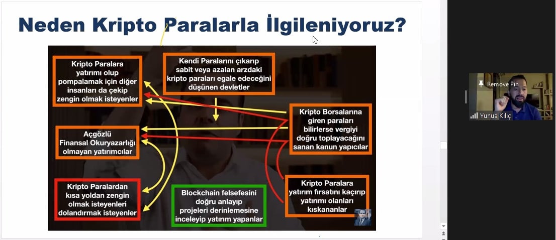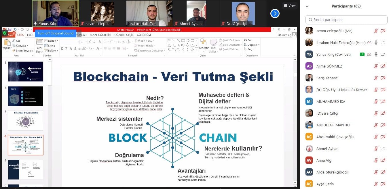 ZOOM video konferans yöntemiyle gerçekleştirilen ve blokzincir teknolojisi, kripto para, kripto para borsaları, kripto paralara yatırım yaparken nelere dikkat edilmeli başlıklarıyla konunun çok yönlü ele alındığı seminer, Akdeniz Üniversitesi Sigortacılık Bölüm Başkanı Öğretim Üyesi Doç. Dr. Yunus Kılıç’ı konuşmacı olarak ağırladı.