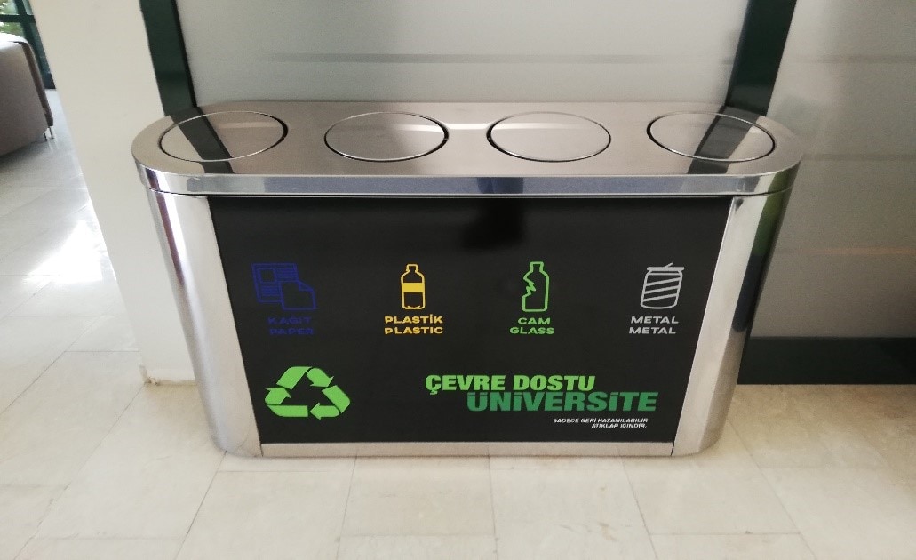 Geri dönüştürülemeyen inorganik atıklar Çevre ve Şehircilik Bakanlığı ile işbirliği içinde toplanmaktadır. Atıklar, sınıfların, ofislerin koridorlarına yerleştirilen bina içi atık ayırma ünitelerine atılmaktadır. Bu atıklar daha sonra türlerine göre ayrıştırılmak üzere günlük olarak kontrol edilmekte ve Belediye tarafından geri dönüşüm için yetkilendirilmiş geri dönüşüm firmasına verilmektedir. Ayrıca dış mekan çöp kutuları, atıkların kaynağında ayrıştırılması için kategorize edilmiş ve etiketlenmiştir. İç mekan atıklarının da kaynağında ayrıştırılması için yeni bina içi çöp kutuları temin edilmiştir.