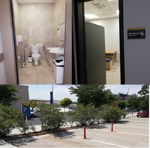 HKÜ Kalite Standartları gereği altyapısını her zaman en süt seviyede tutmaya özen göstermektedir. Birinci bölümde de bahsedildiği üzere, HKÜ yapmış olduğu iyi uygulamalarla TS EN ISO 9001:2015 Kalite Yönetim Sistemi standartlarına uygun olarak yükseköğretim hizmetleri kapsamında gerçekleştirilen denetimler sonucunda Kalite Belgesi’ne sahiptir. Bu standardın en önemli gerekliliklerinden bir tanesi de ulaşılabilirlik olup, özellikle engelli bireyler için kampüs içerisinde çalışmaların yapılmasıdır. Bu kapsamda, HKÜ tüm birimlerine kolay ulaşım politikası yürütmüştür. HKÜ binaları ve yaya yolları engelli öğrencilerin tüm sınıflara, ofislere ve fakülte birimlerine kolaylıkla ulaşabileceği şekilde inşa edilmiştir. Binaların bütün girişlerinde tekerlekli sandalye girişi için uygun özelliklerde yapılmış olan rampalar bulunmaktadır. Ayrıca engelli park alanları da tabela ve işaretçilerle belirlenmiştir. Bu uygulamalara ait bazı görseller aşağıda sunulmuştur.